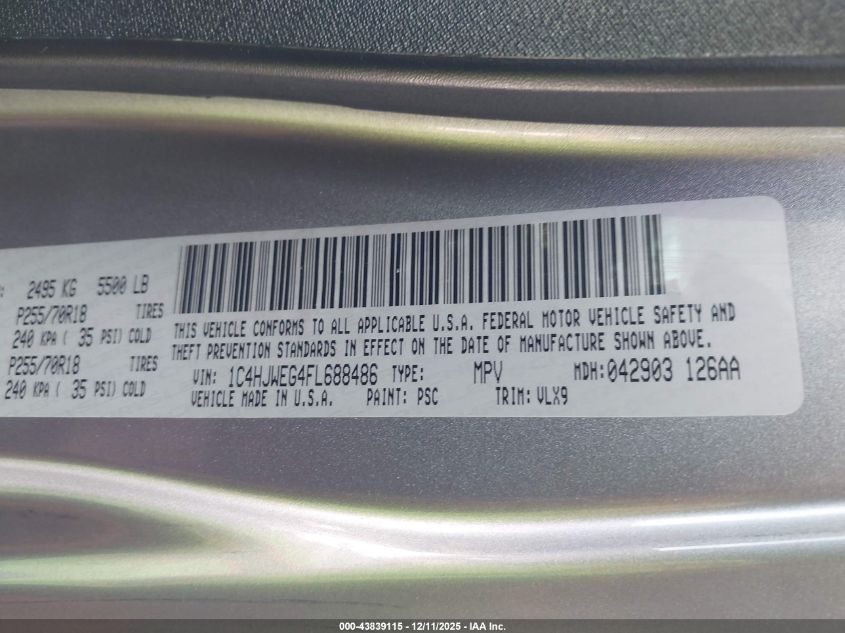 2015 JEEP WRANGLER 2015 року Бензин, 3.6, Повний привід, vin - 1C4HJWEG4FL688486 з США