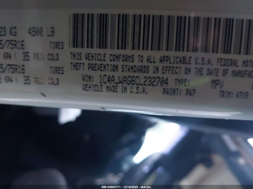 Колір БілийЦиліндри 6Привід Повний привідVIN 1C4AJWAG6CL232704Стан Заводиться та їде (перевірено)Ушкодження Передня або задня AutoRIA