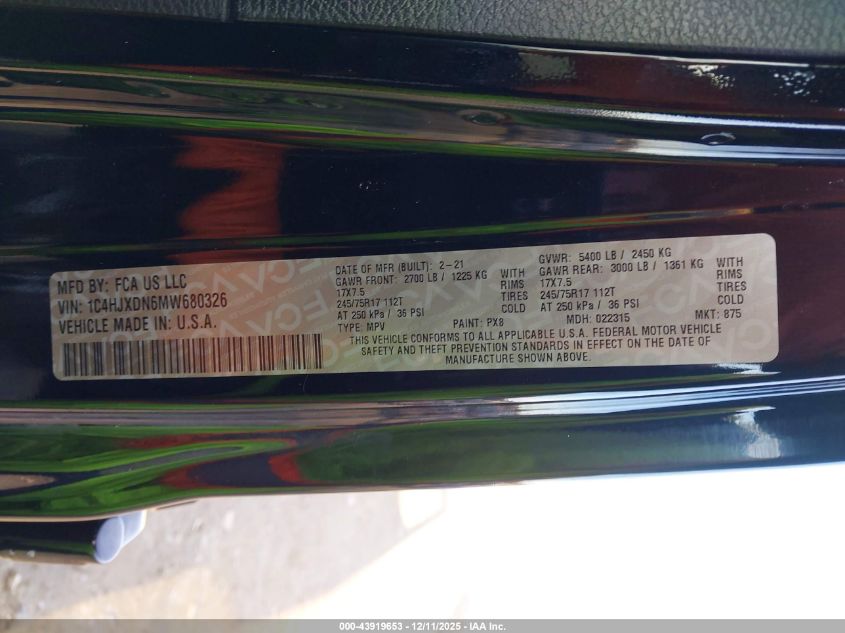 Колір ЧорнийЦиліндри 4Привід Повний привідVIN 1C4HJXDN6MW680326Стан СтаціонарноУшкодження Перекидання AutoRIA