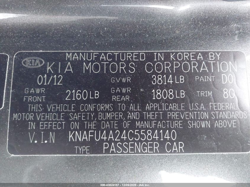 2012 KIA FORTE 2012 року Бензин, 2.0, Передній привід, vin - KNAFU4A24C5584140 з США