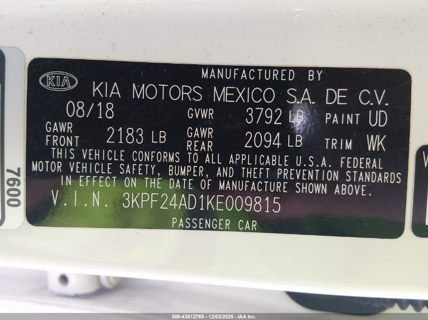 2019 KIA FORTE 2019 року Бензин, 2.0, Передній привід, vin - 3KPF24AD1KE009815 з США