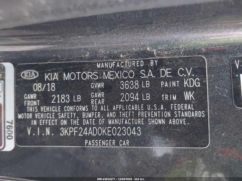 2019 KIA FORTE 2019 року Бензин, 2.0, Передній привід, vin - 3KPF24AD0KE023043 з США