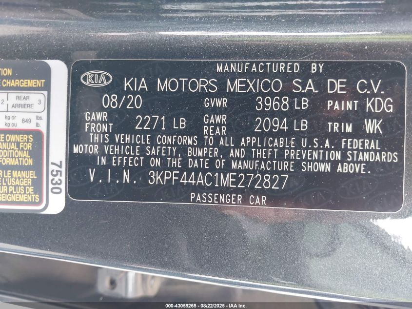 2021 KIA FORTE 2021 року Бензин, 1.6, Передній привід, vin - 3KPF44AC1ME272827 з США