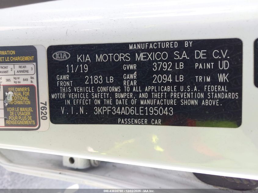 2020 KIA FORTE 2020 року Бензин, 2.0, Передній привід, vin - 3KPF34AD6LE195043 з США