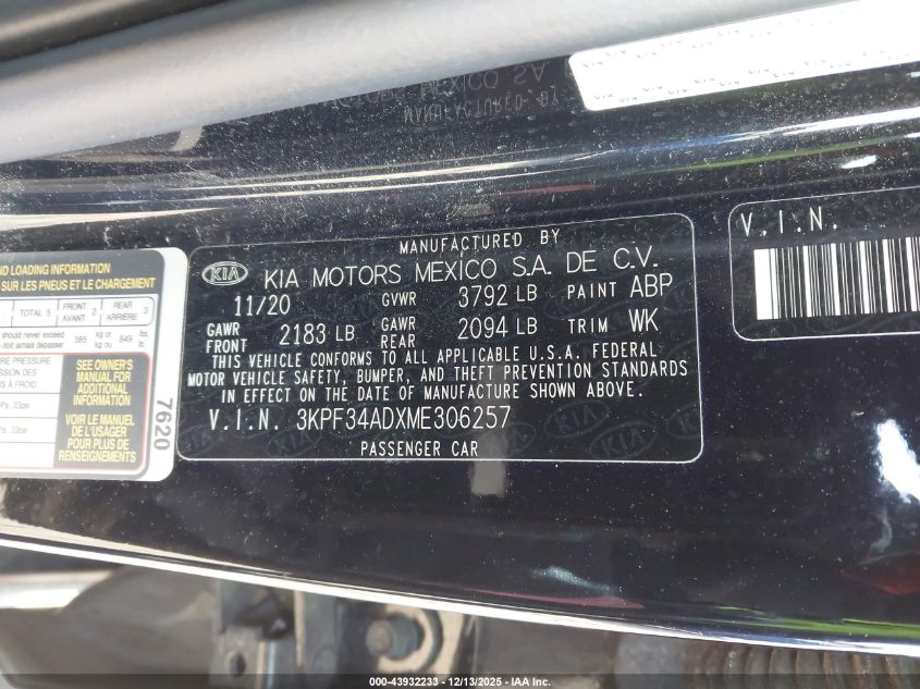 2021 KIA FORTE 2021 року Бензин, 2.0, Передній привід, vin - 3KPF34ADXME306257 з США