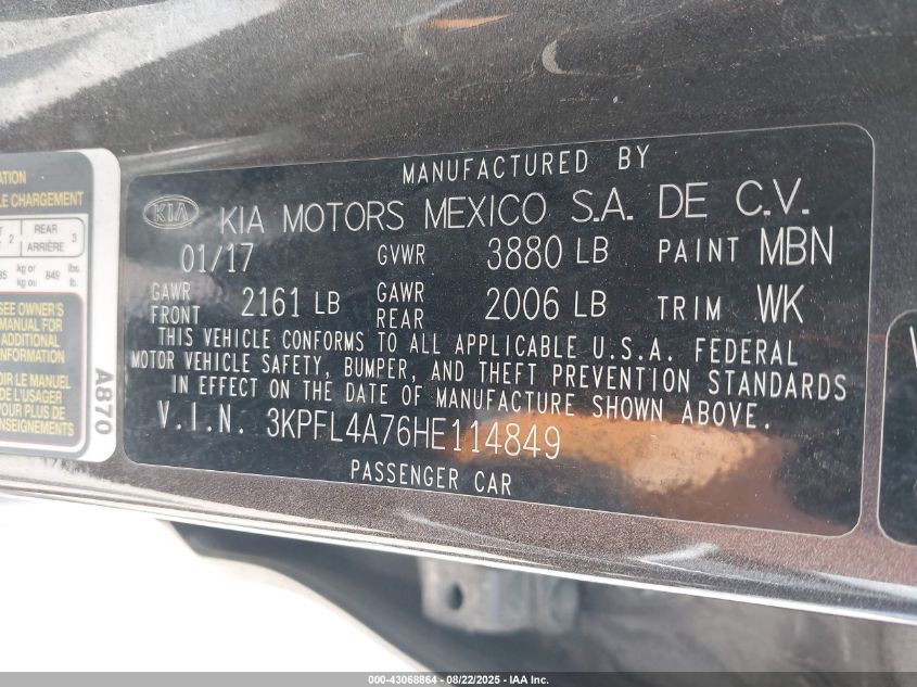 2017 KIA FORTE 2017 року Бензин, 2.0, Передній привід, vin - 3KPFL4A76HE114849 з США
