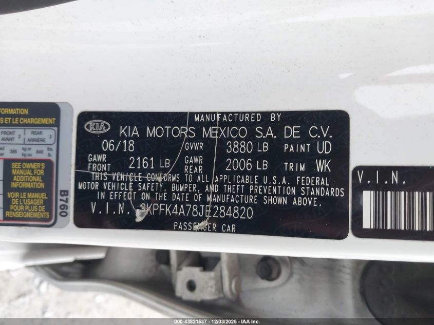 2018 KIA FORTE 2018 року Бензин, 2.0, Передній привід, vin - 3KPFK4A78JE284820 з США