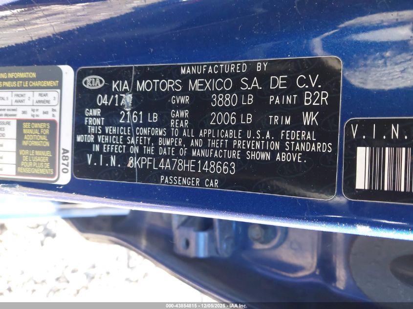 2017 KIA FORTE 2017 року Бензин, 2.0, Передній привід, vin - 3KPFL4A78HE148663 з США