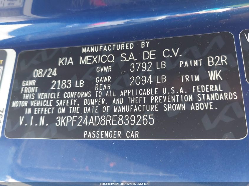 2024 KIA FORTE 2024 року Бензин, 2.0, Передній привід, vin - 3KPF24AD8RE839265 з США