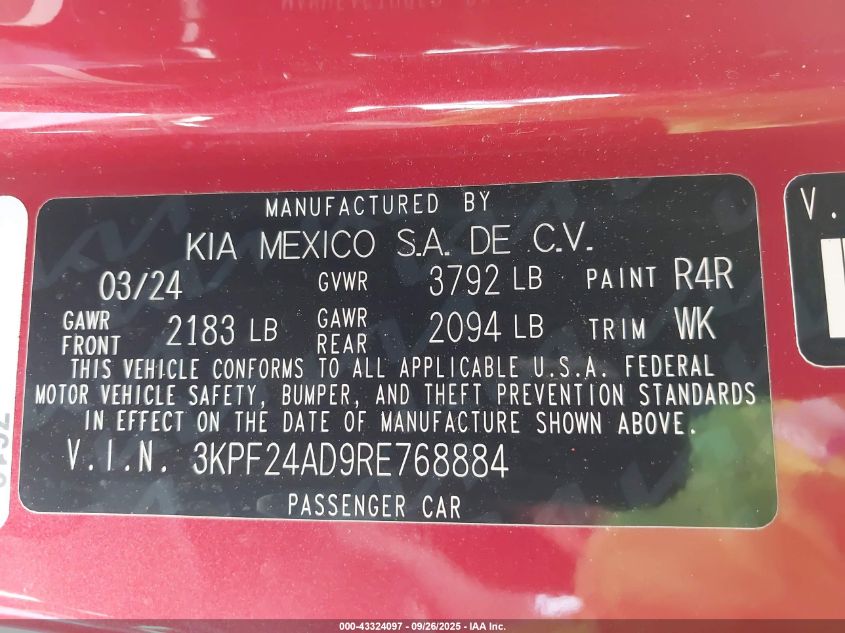 2024 KIA FORTE 2024 року Бензин, 2.0, Передній привід, vin - 3KPF24AD9RE768884 з США