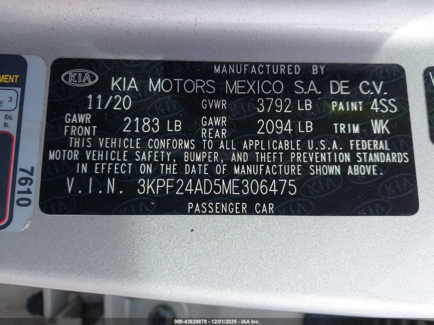 2021 KIA FORTE 2021 року Бензин, 2.0, Передній привід, vin - 3KPF24AD5ME306475 з США