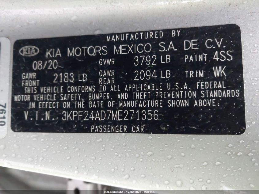 2021 KIA FORTE 2021 року Бензин, 2.0, Передній привід, vin - 3KPF24AD7ME271356 з США