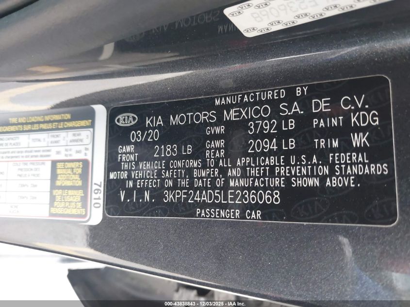 2020 KIA FORTE 2020 року Бензин, 2.0, Передній привід, vin - 3KPF24AD5LE236068 з США