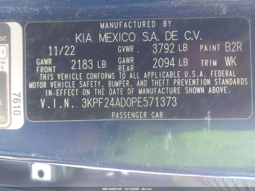 2023 KIA FORTE 2023 року Бензин, 2.0, Передній привід, vin - 3KPF24AD0PE571373 з США