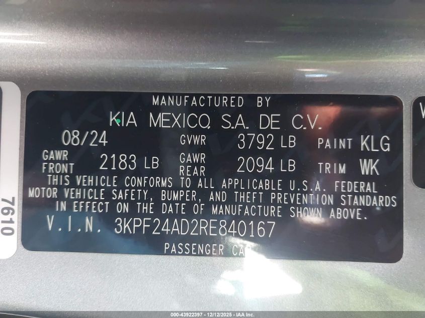 2024 KIA FORTE 2024 року Бензин, 2.0, Передній привід, vin - 3KPF24AD2RE840167 з США