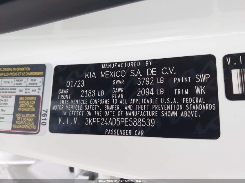 2023 KIA FORTE 2023 року Бензин, 2.0, Передній привід, vin - 3KPF24AD5PE588539 з США