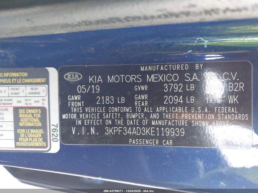 2019 KIA FORTE 2019 року Бензин, 2.0, Передній привід, vin - 3KPF34AD3KE119939 з США