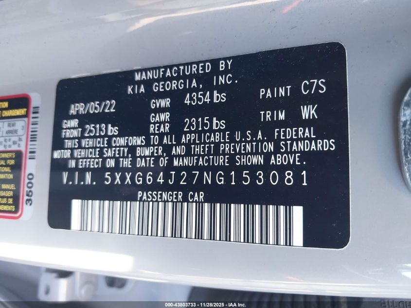 2022 KIA K5 2022 року Бензин, 1.6, Передній привід, vin - 5XXG64J27NG153081 з США