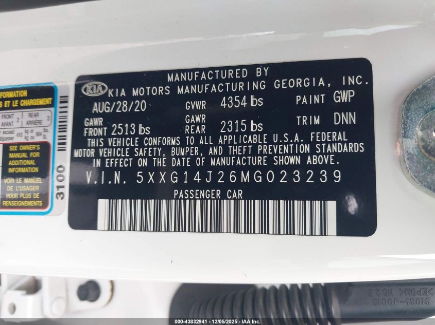 2021 KIA K5 2021 року Бензин, 1.6, Передній привід, vin - 5XXG14J26MG023239 з США