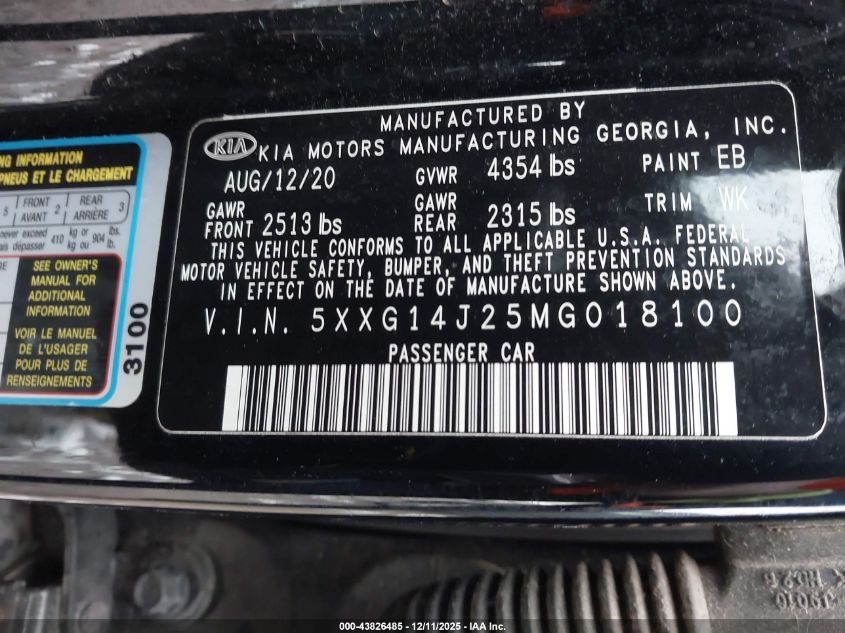 2021 KIA K5 2021 року Бензин, 1.6, Передній привід, vin - 5XXG14J25MG018100 з США