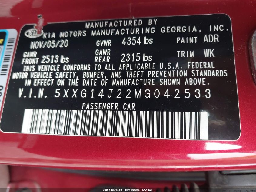 2021 KIA K5 2021 року Бензин, 1.6, Передній привід, vin - 5XXG14J22MG042533 з США