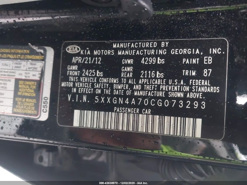 2012 KIA OPTIMA 2012 року Бензин, 2.4, Передній привід, vin - 5XXGN4A70CG073293 з США