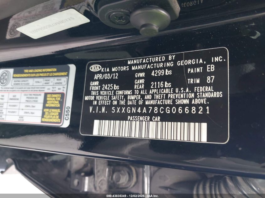 2012 KIA OPTIMA 2012 року Бензин, 2.4, Передній привід, vin - 5XXGN4A78CG066821 з США