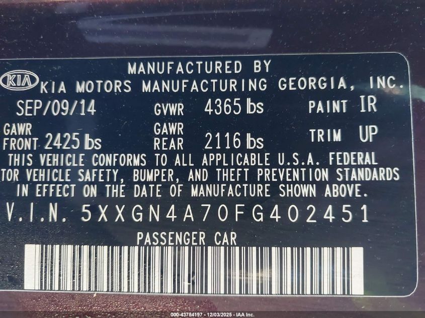 2015 KIA OPTIMA 2015 року Бензин, 2.4, Передній привід, vin - 5XXGN4A70FG402451 з США