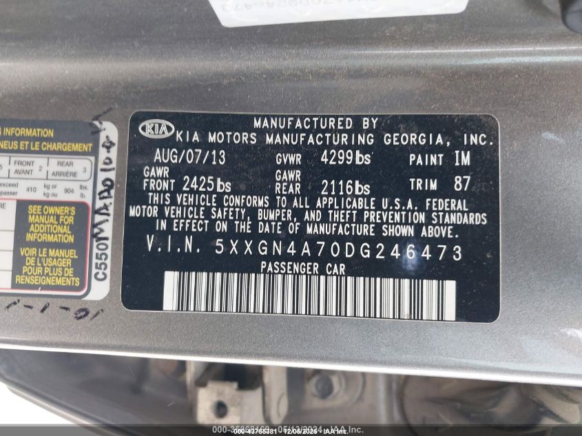 2013 KIA OPTIMA 2013 року Бензин, 2.4, Передній привід, vin - 5XXGN4A70DG246473 з США