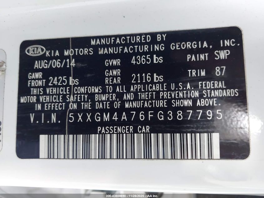 2015 KIA OPTIMA 2015 року Бензин, 2.4, Передній привід, vin - 5XXGM4A76FG387795 з США