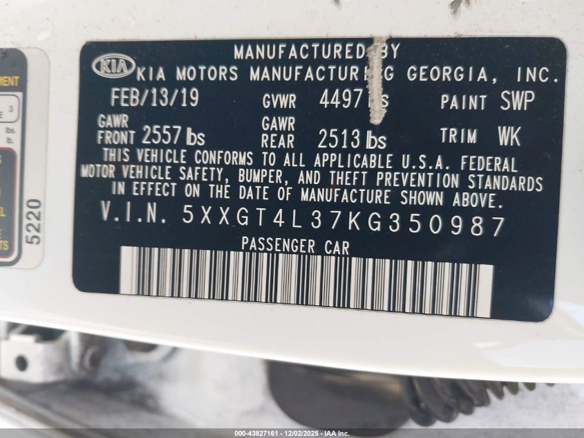 2019 KIA OPTIMA 2019 року Бензин, 2.4, Передній привід, vin - 5XXGT4L37KG350987 з США