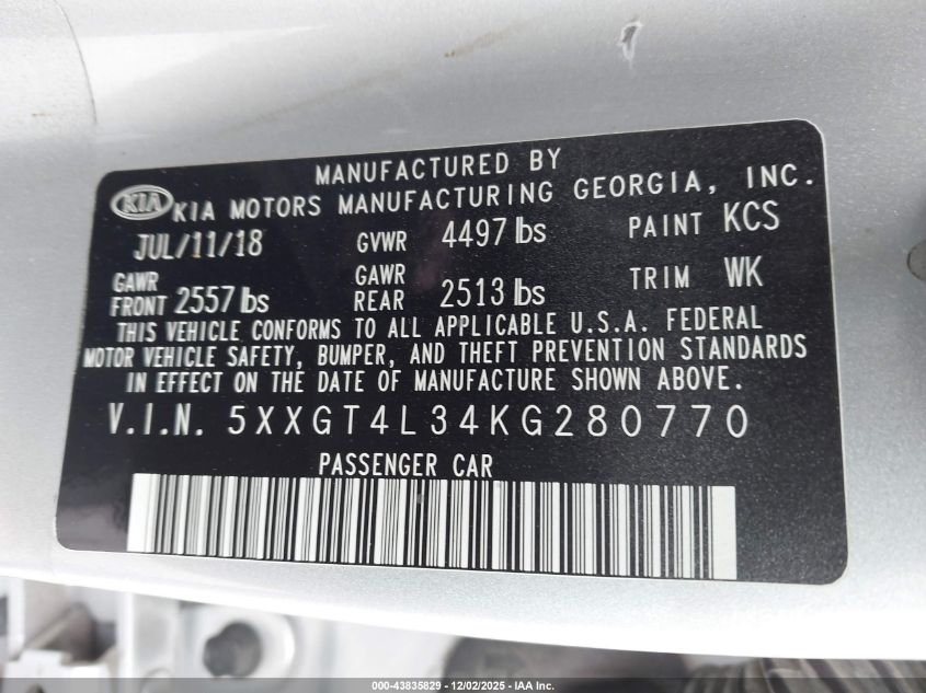 2019 KIA OPTIMA 2019 року Бензин, 2.4, Передній привід, vin - 5XXGT4L34KG280770 з США