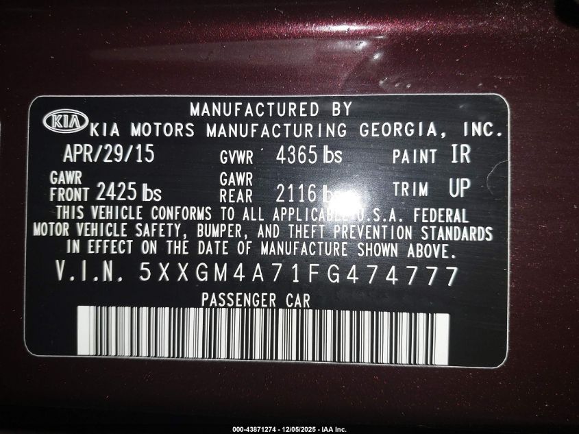 2015 KIA OPTIMA 2015 року Бензин, 2.4, Передній привід, vin - 5XXGM4A71FG474777 з США