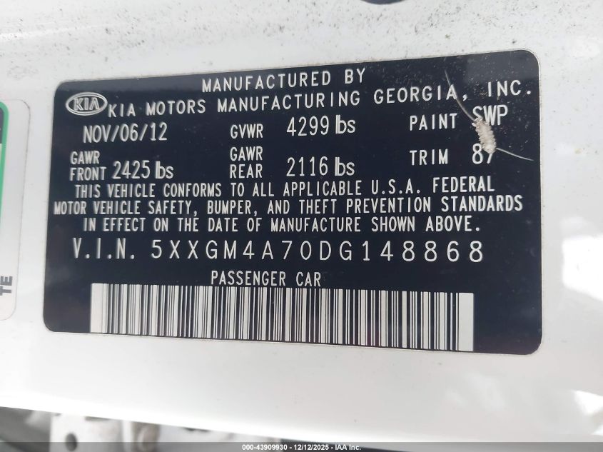 2013 KIA OPTIMA 2013 року Бензин, 2.4, Передній привід, vin - 5XXGM4A70DG148868 з США