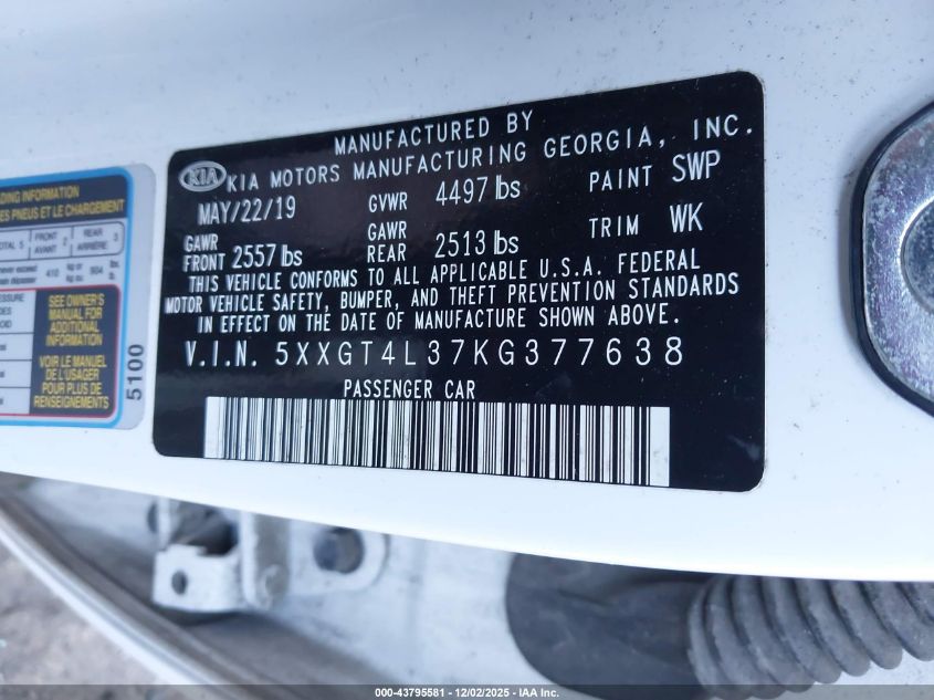 2019 KIA OPTIMA 2019 року Бензин, 2.4, Передній привід, vin - 5XXGT4L37KG377638 з США