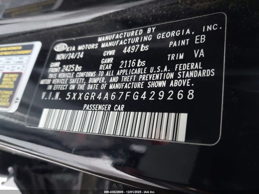 2015 KIA OPTIMA 2015 року Бензин, 2.0, Передній привід, vin - 5XXGR4A67FG429268 з США