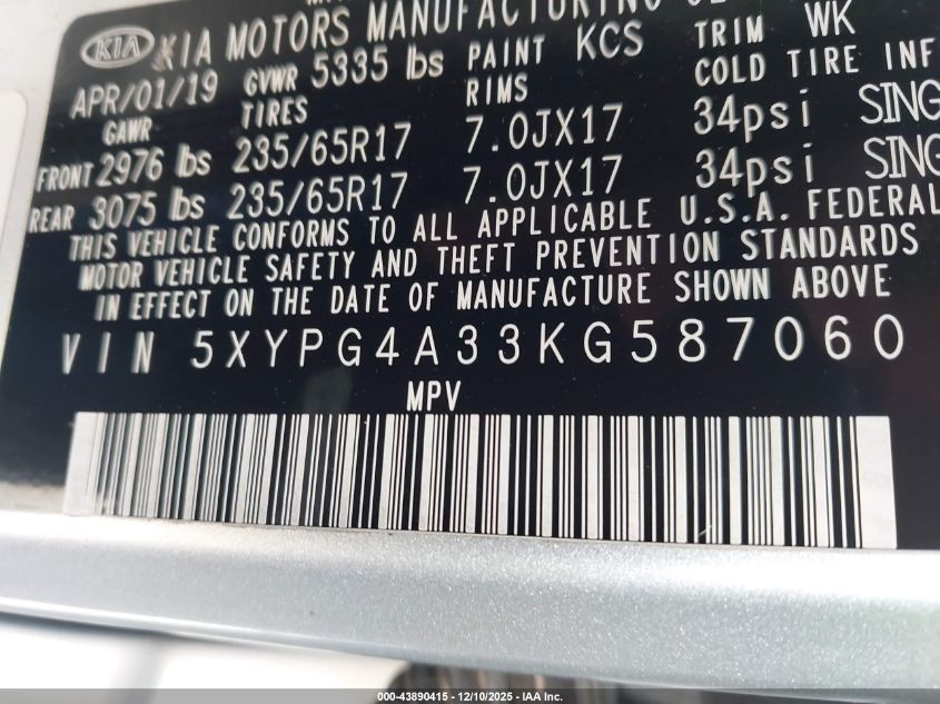 2019 KIA SORENTO 2019 року Бензин, 2.4, Передній привід, vin - 5XYPG4A33KG587060 з США