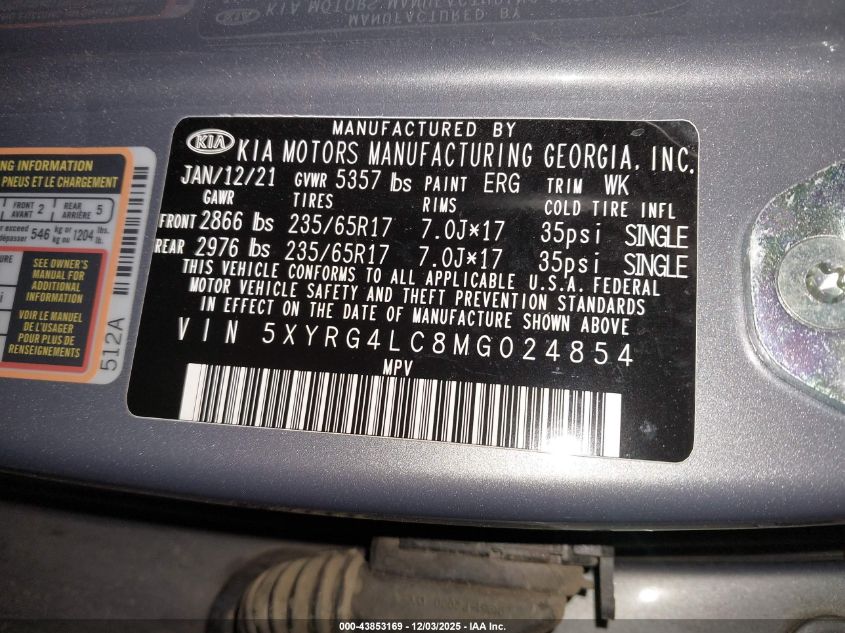 2021 KIA SORENTO 2021 року Бензин, 2.5, Передній привід, vin - 5XYRG4LC8MG024854 з США