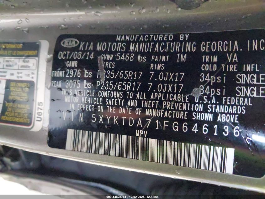 2015 KIA SORENTO 2015 року Бензин, 3.3, Повний привід, vin - 5XYKTDA71FG646136 з США