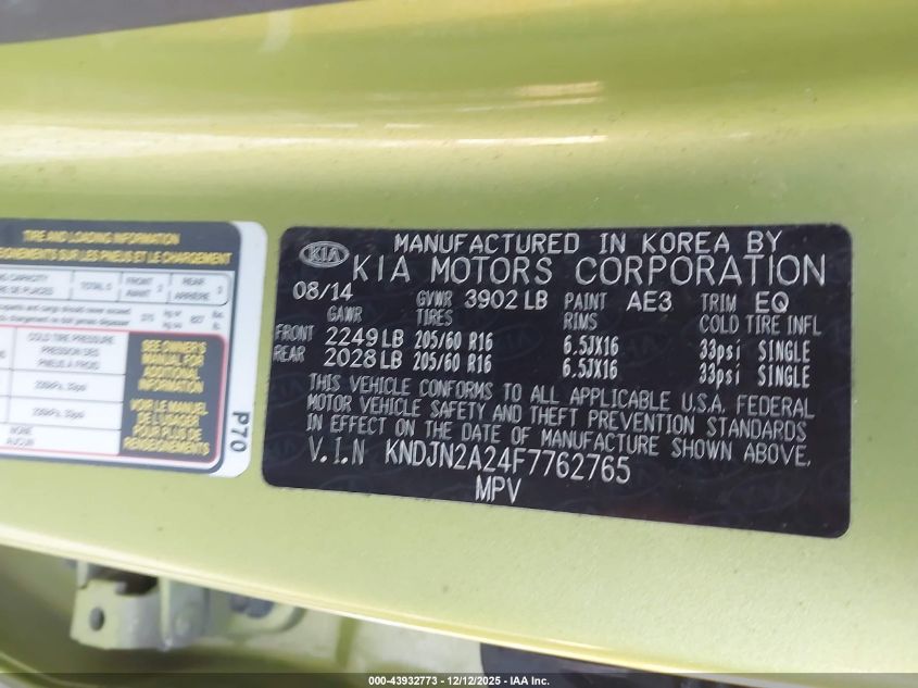 2015 KIA SOUL 2015 року Бензин, 1.6, Передній привід, vin - KNDJN2A24F7762765 з США