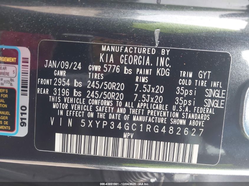 2024 KIA TELLURIDE 2024 року Бензин, 3.8, Передній привід, vin - 5XYP34GC1RG482627 з США