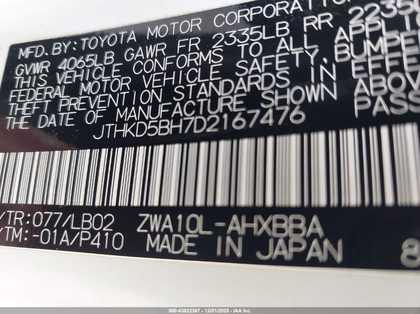 Колір БілийЦиліндри 4Привід Передній привідVIN JTHKD5BH7D2167476Стан Заводиться та їде (перевірено)Ушкодження Звичайний зносДата аукціону 2025-12-09 AutoRIA