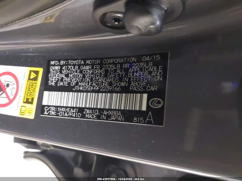 2015 LEXUS CT 200H 2015 року Гібрид, 1.8, Передній привід, vin - JTHKD5BH9F2239166 з США