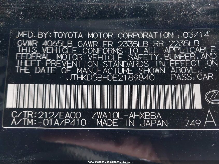 2014 LEXUS CT 200H 2014 року Гібрид, 1.8, Передній привід, vin - JTHKD5BH0E2189840 з США