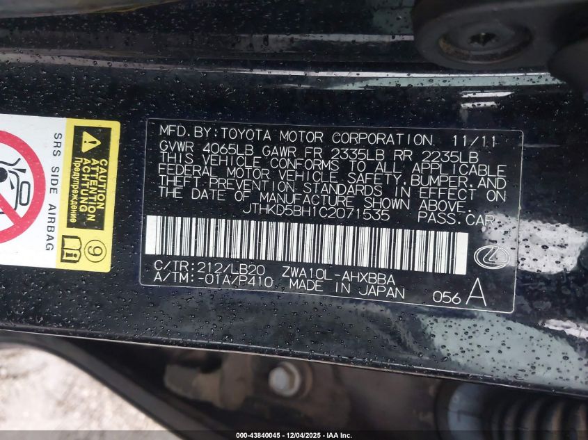 2012 LEXUS CT 200H 2012 року Гібрид, 1.8, Передній привід, vin - JTHKD5BH1C2071535 з США