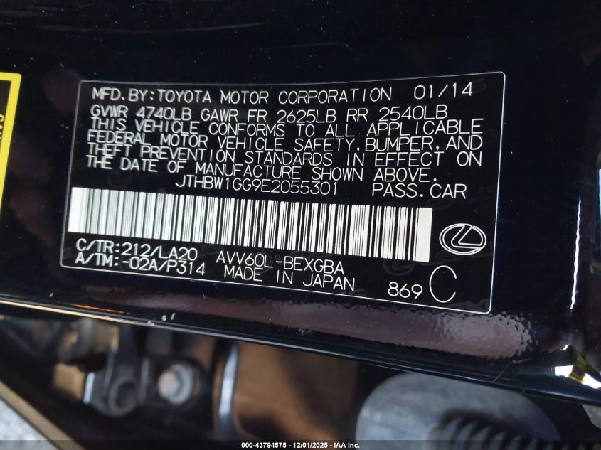 2014 LEXUS ES 300H 2014 року Гібрид, 2.5, Передній привід, vin - JTHBW1GG9E2055301 з США