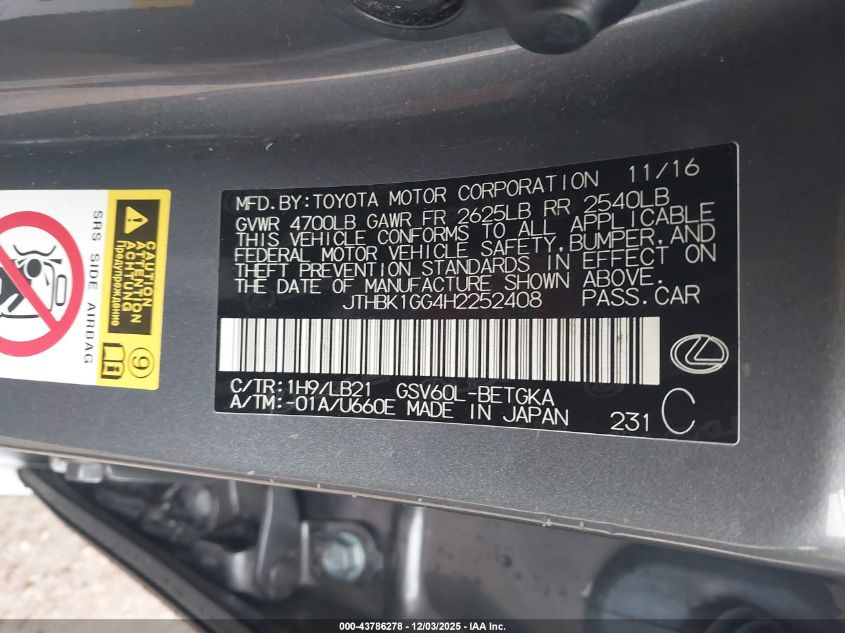 Колір СірийЦиліндри 6Привід Передній привідVIN JTHBK1GG4H2252408Стан Заводиться та їде (перевірено)Ушкодження Ліва сторона AutoRIA