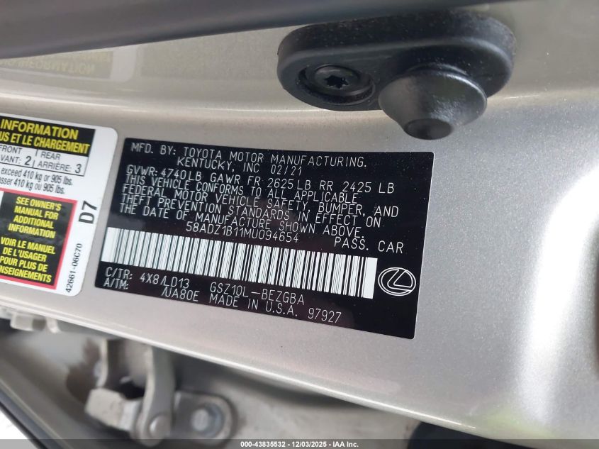 2021 LEXUS ES 350 2021 року Бензин, 3.5, Передній привід, vin - 58ADZ1B11MU094654 з США