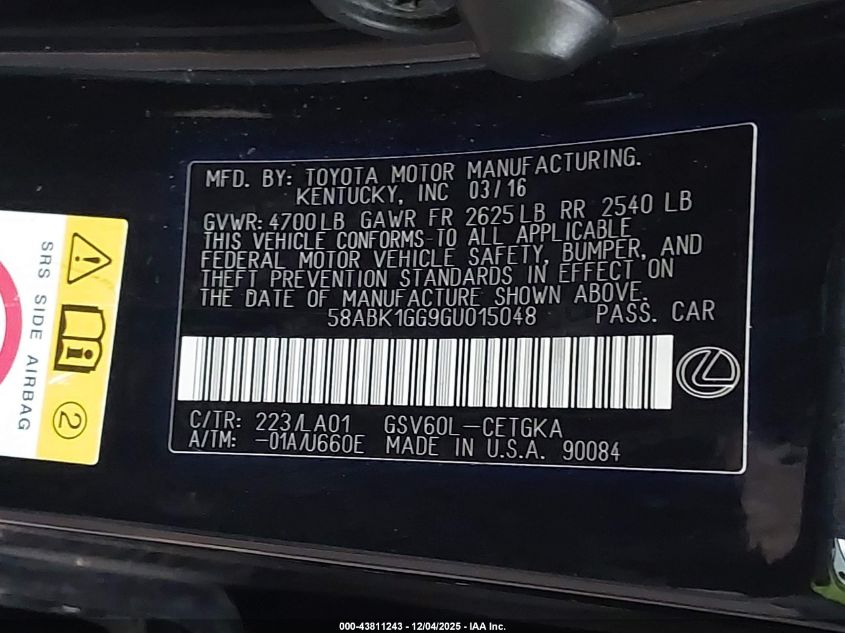 2016 LEXUS ES 350 2016 року Бензин, 3.5, Передній привід, vin - 58ABK1GG9GU015048 з США
