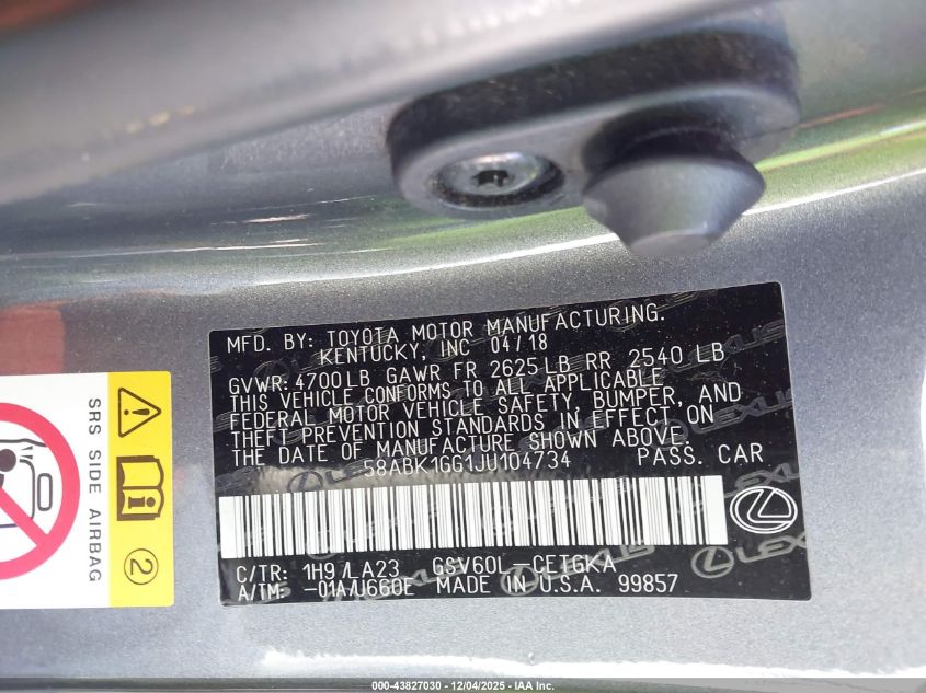 2018 LEXUS ES 350 2018 року Бензин, 3.5, Передній привід, vin - 58ABK1GG1JU104734 з США